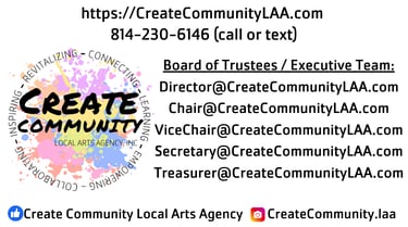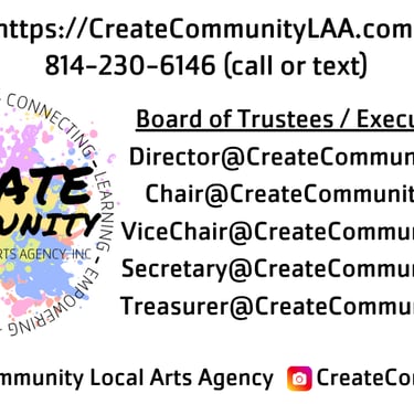 NAME AND PURPOSE: The name of this organization is Create Community Local Arts Agency, Inc. (CC). We are the Local Arts Agency based in Warren County, Pennsylvania. Our purpose is to foster community growth and development through arts, culture, and heritage.