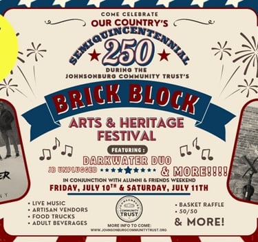 The Johnsonburg Community Trust (JCT) is pleased to welcome artists, artisans, makers, heritage vendors, and food trucks, trailers, or tents to our two-day Brick Block Arts & Heritage Festival, taking place Friday, July 10 (4:00–11:00 PM) and Saturday, July 11 (10:00 AM–5:00 PM) in the heart of historic downtown Johnsonburg.